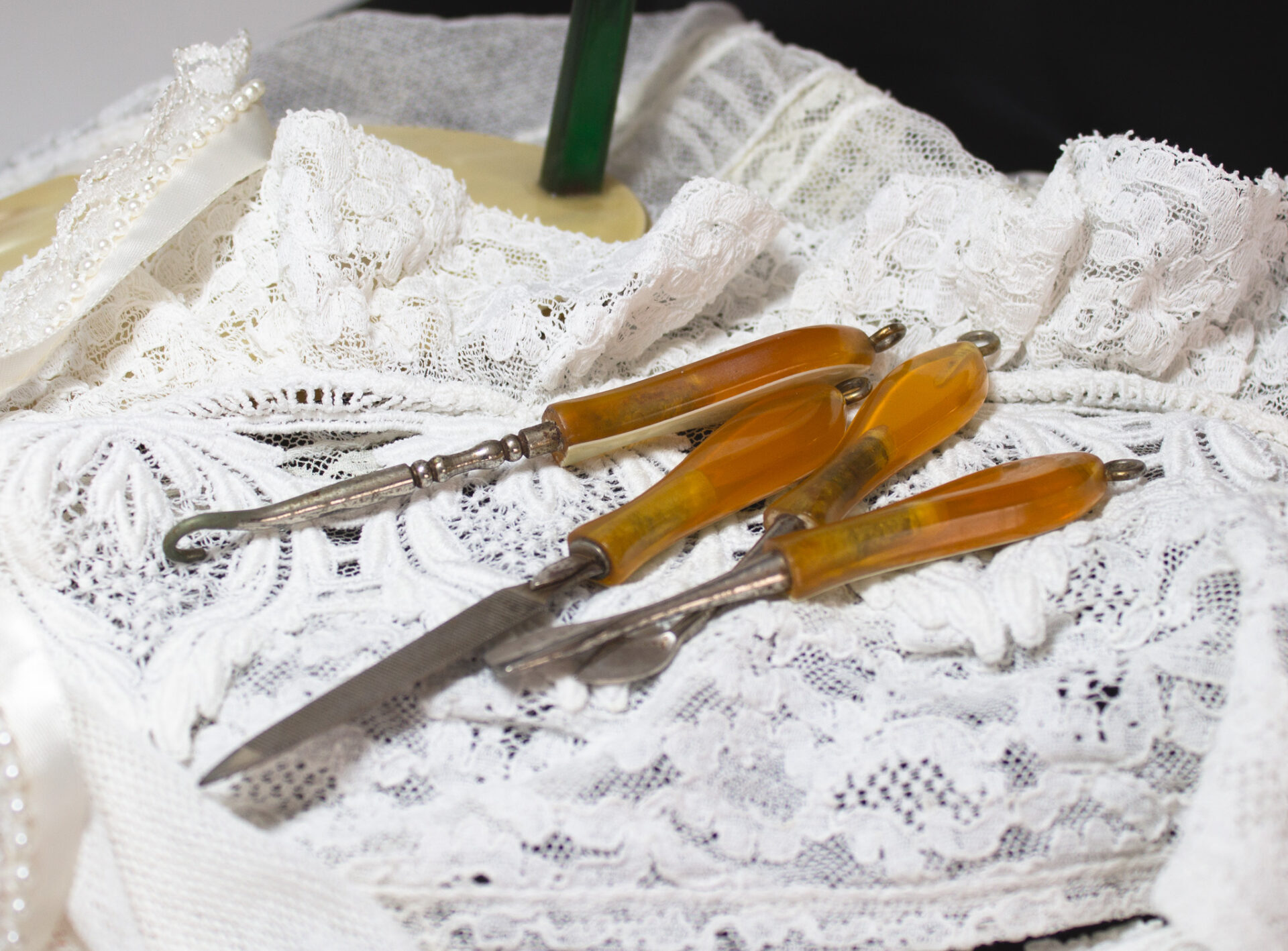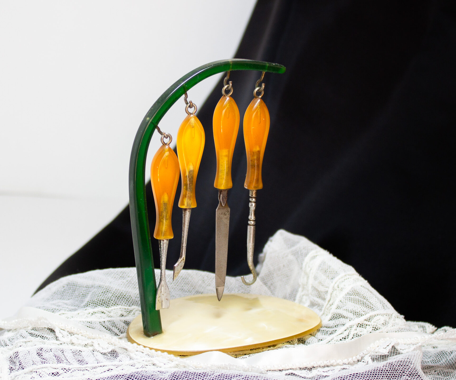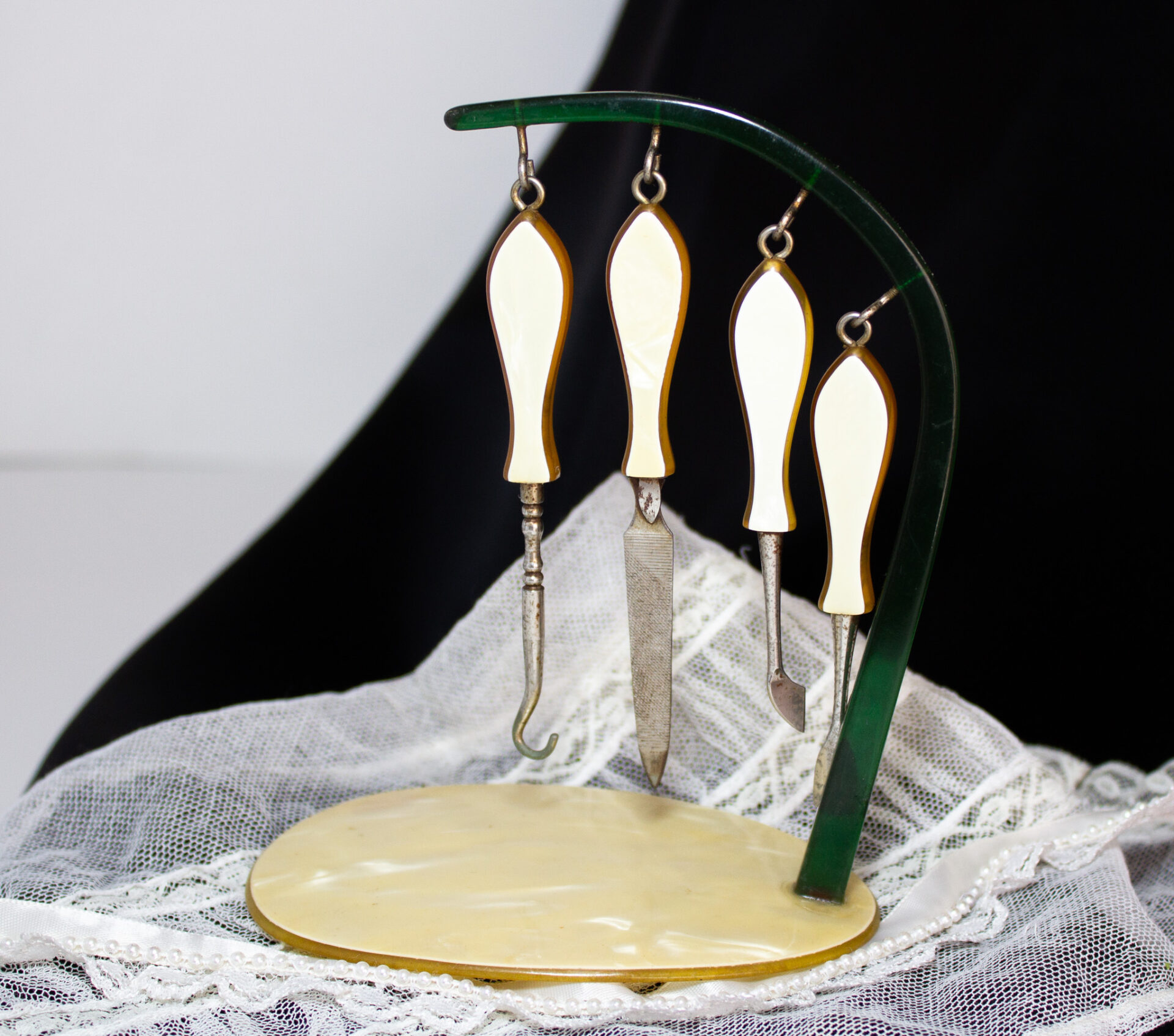 One Button Hook and Three Manicure Tools Hang on the Celluloid Stand.