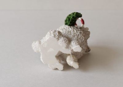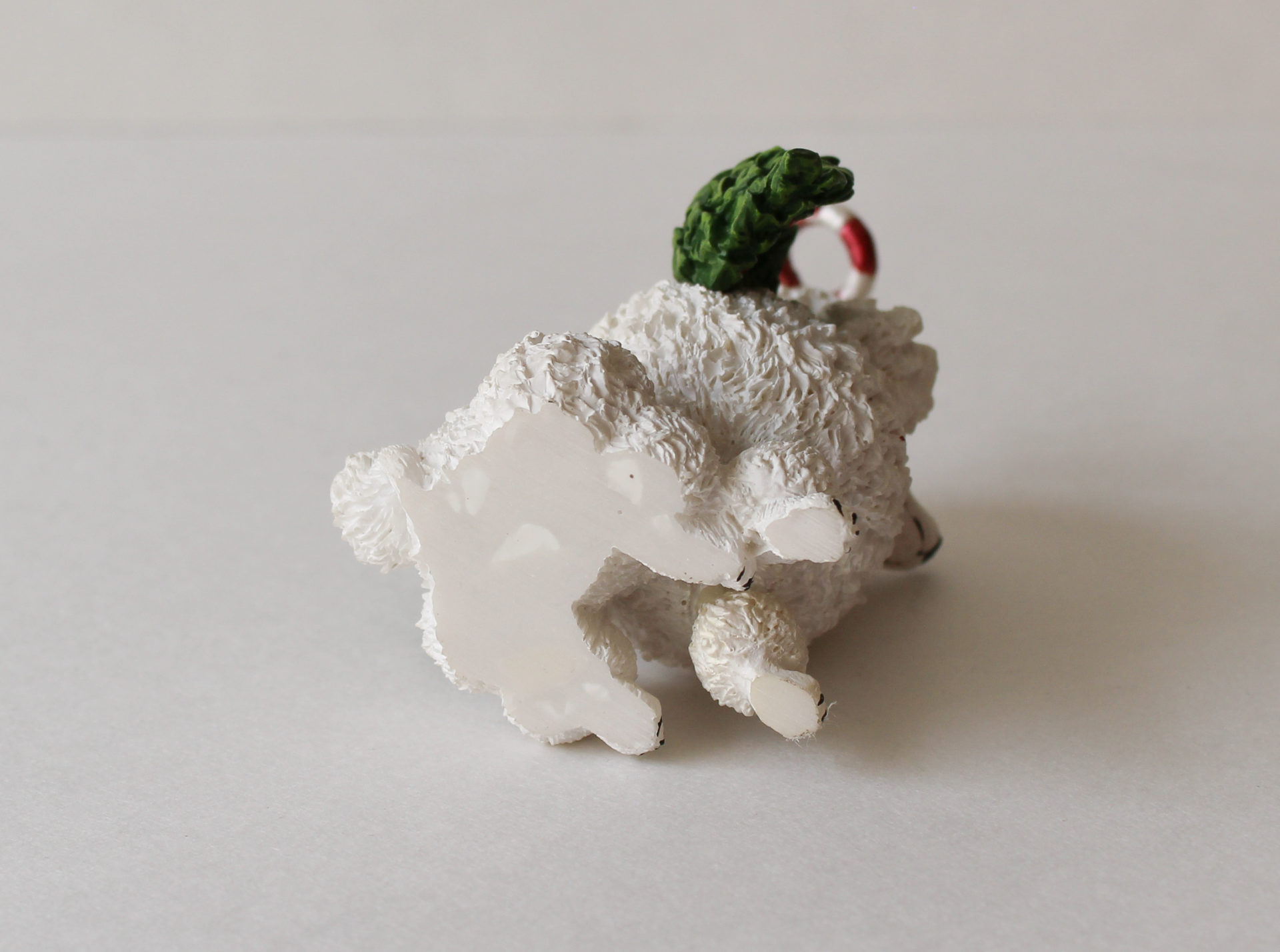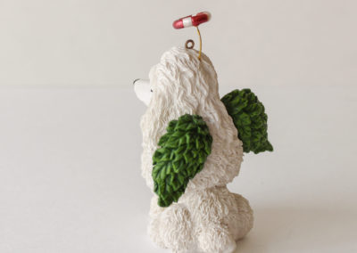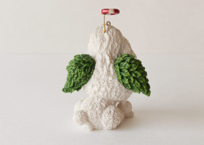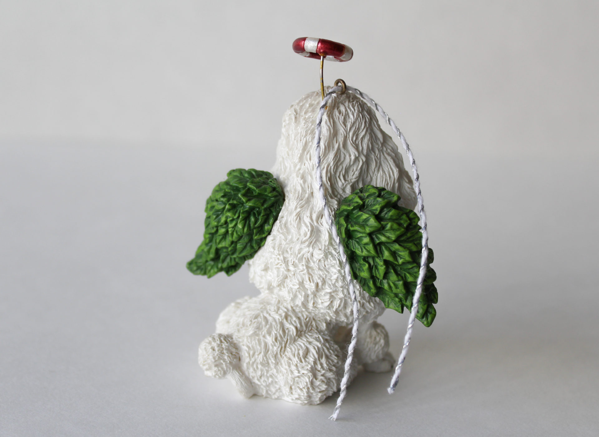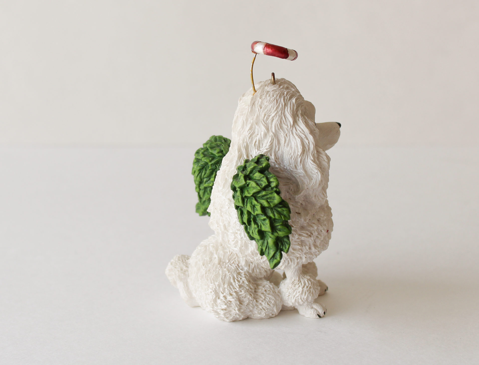 Pure White Poodle With Tree Green Wings and a Halo on Top.