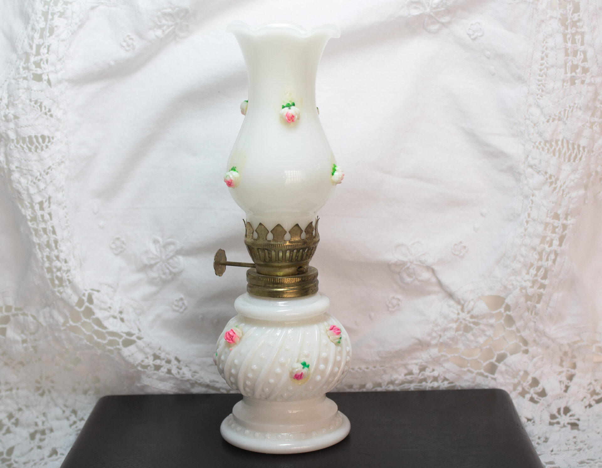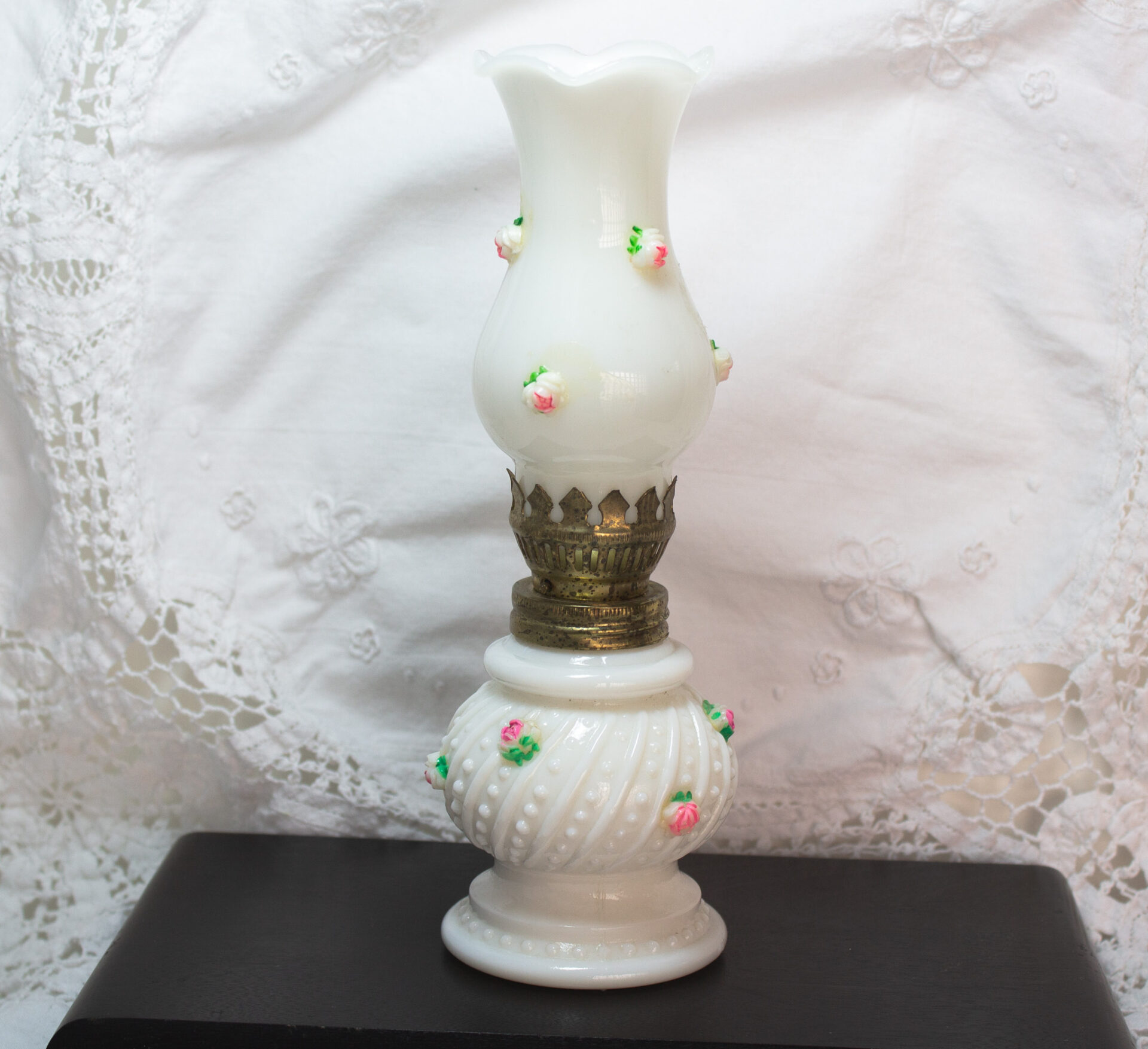 Milk Glass Miniature Oil Lamp Pink Porcelain Rose Buds