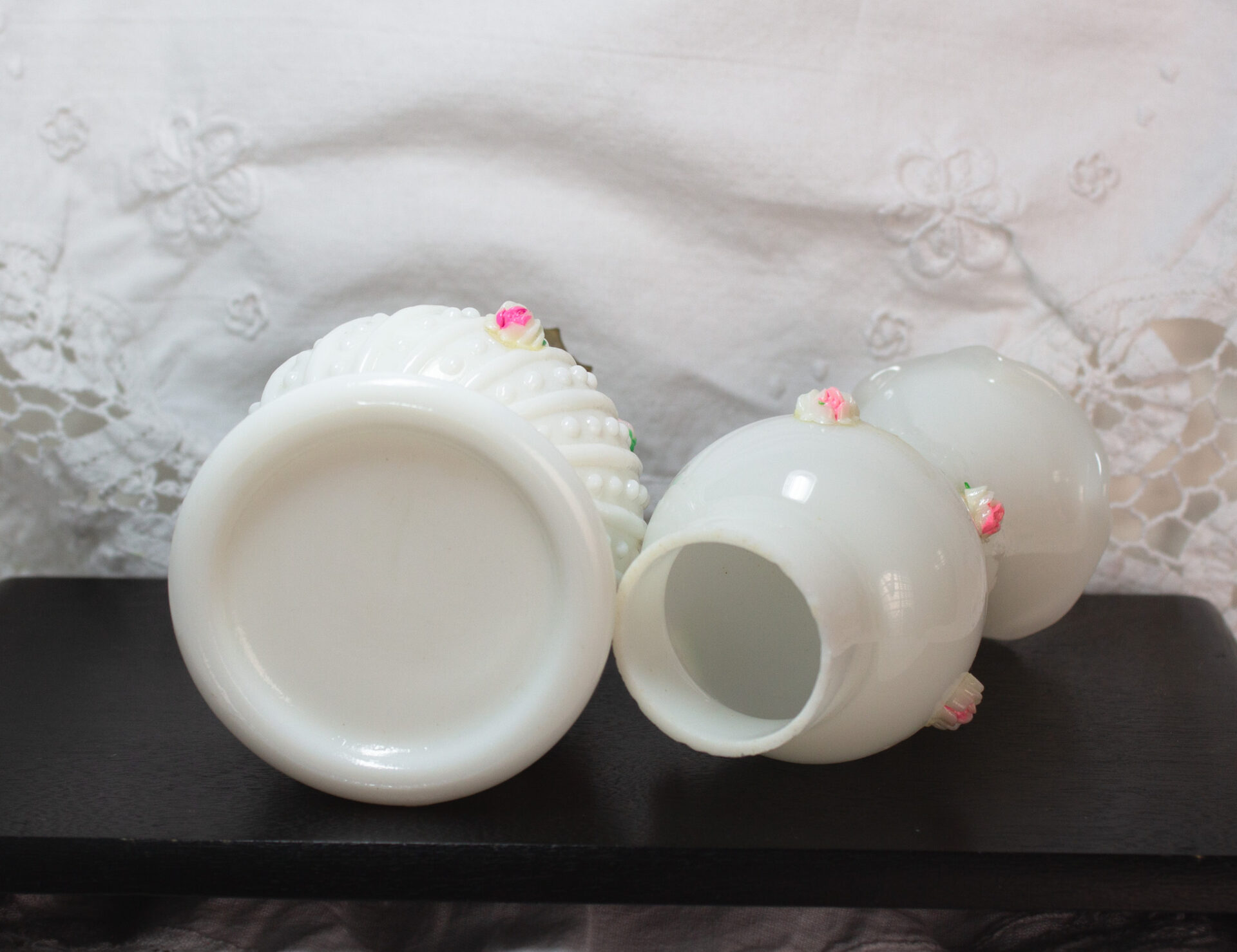 Lovely Miniature Milk Glass Oil Lamp Features Pink Porcelain Flowers.