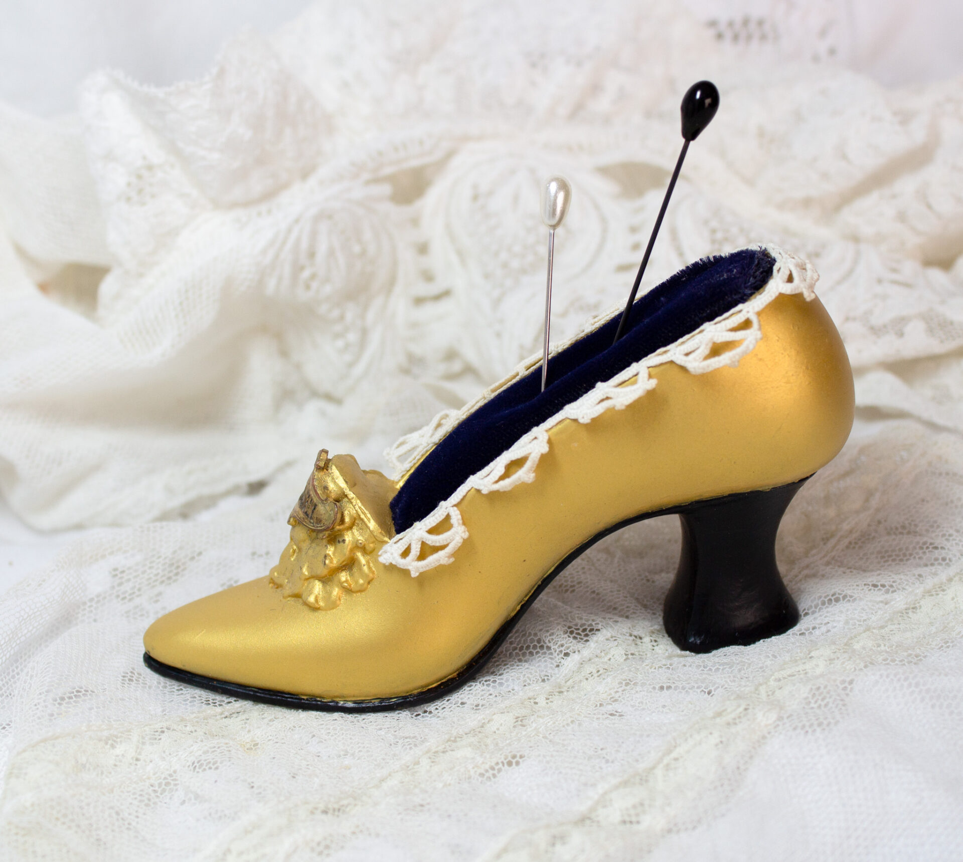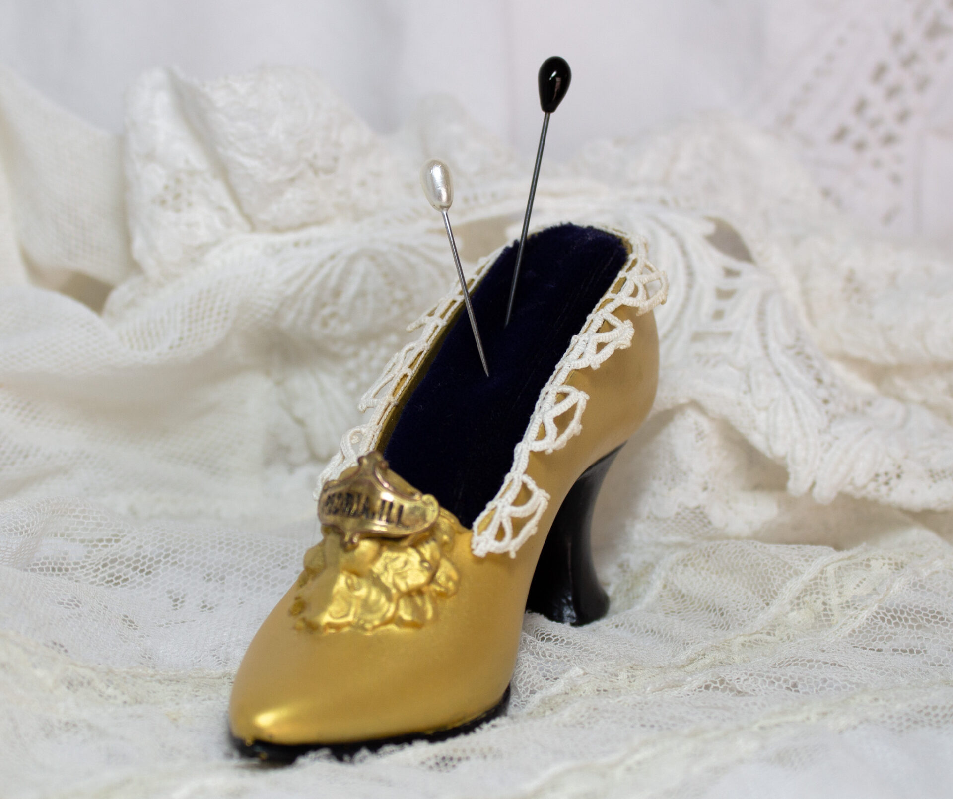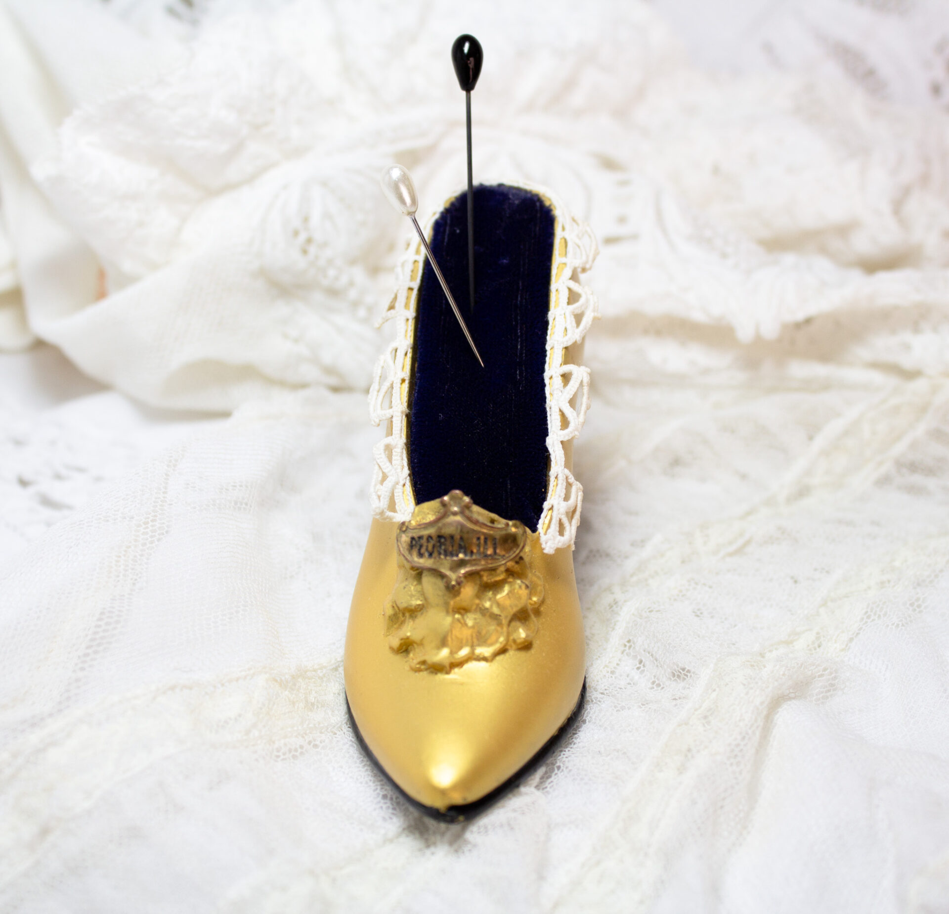 Vintage Metal Miniature Shoe with Gold Tone Finish, Navy Blue Velvet Pin Cushion, and Trimmed in Antique Lace.