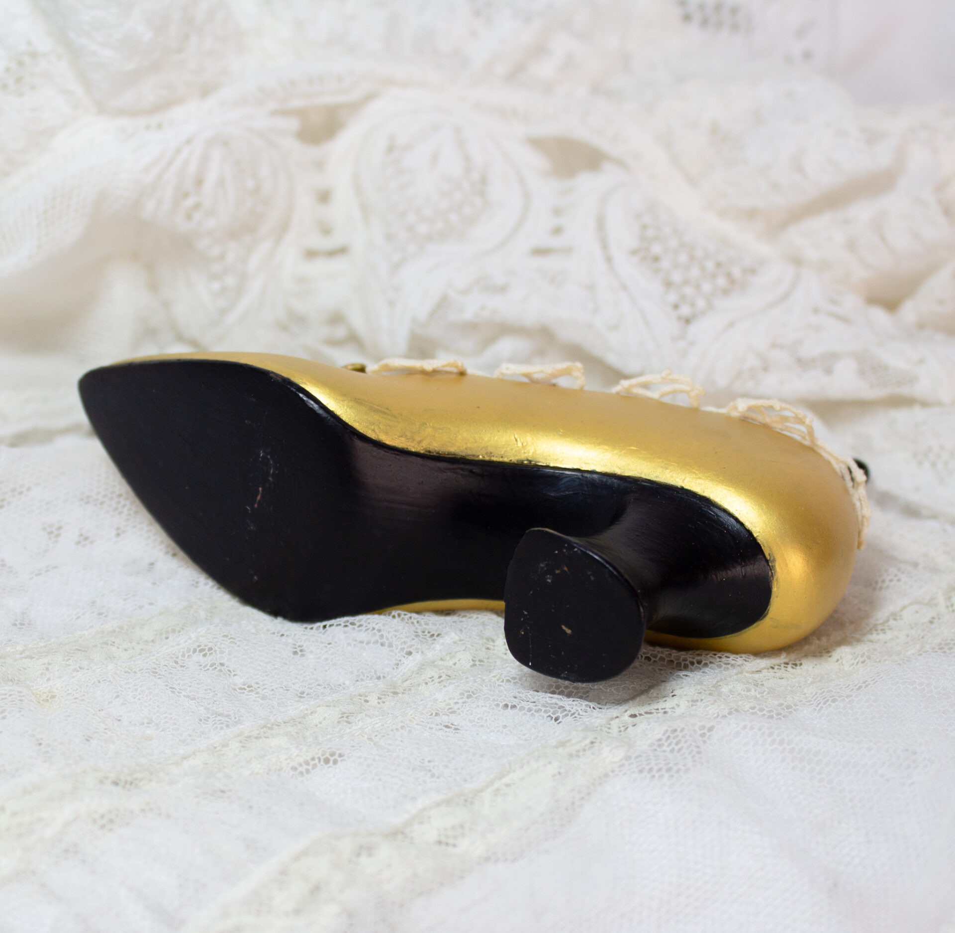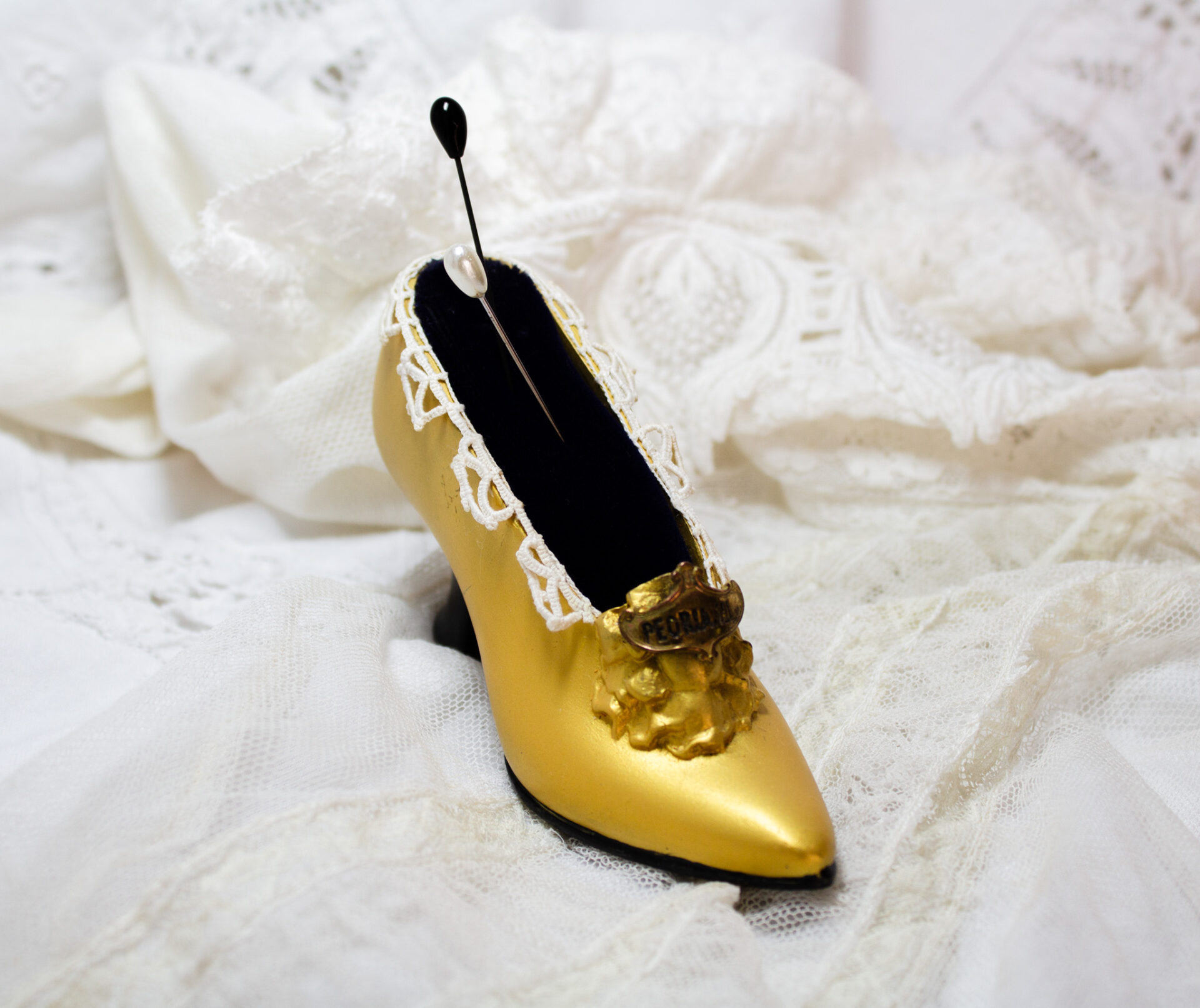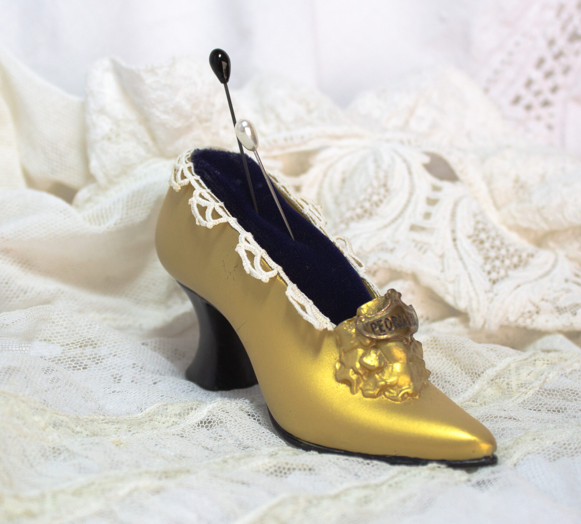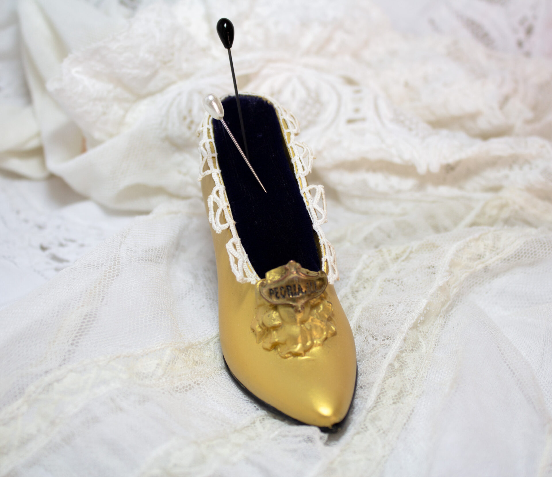 Vintage Metal Miniature Shoe with Gold Tone Finish, Navy Blue Velvet Pin Cushion, and Trimmed in Antique Lace.