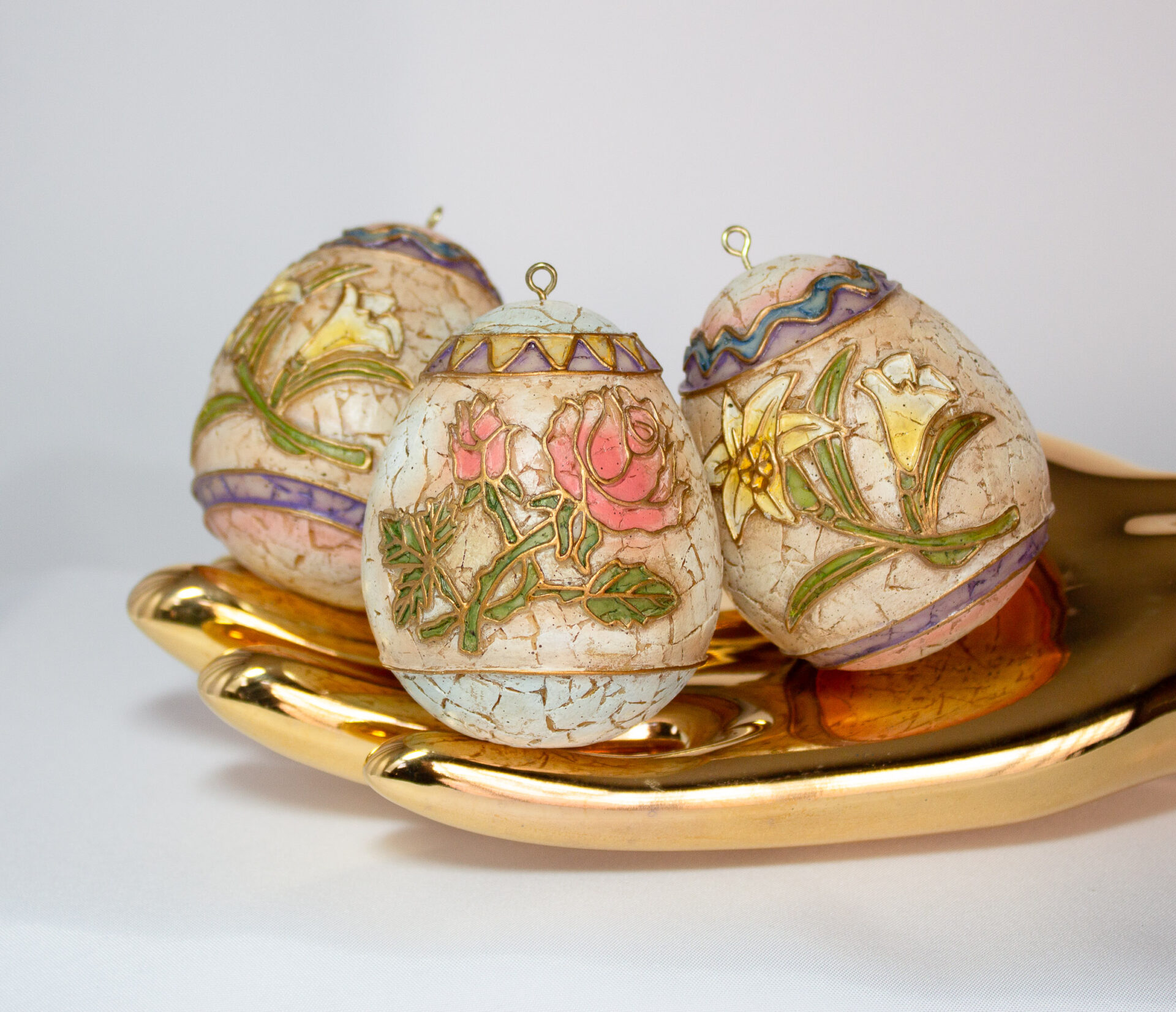 Set of Three Crackle Finish Resin Easter Eggs.