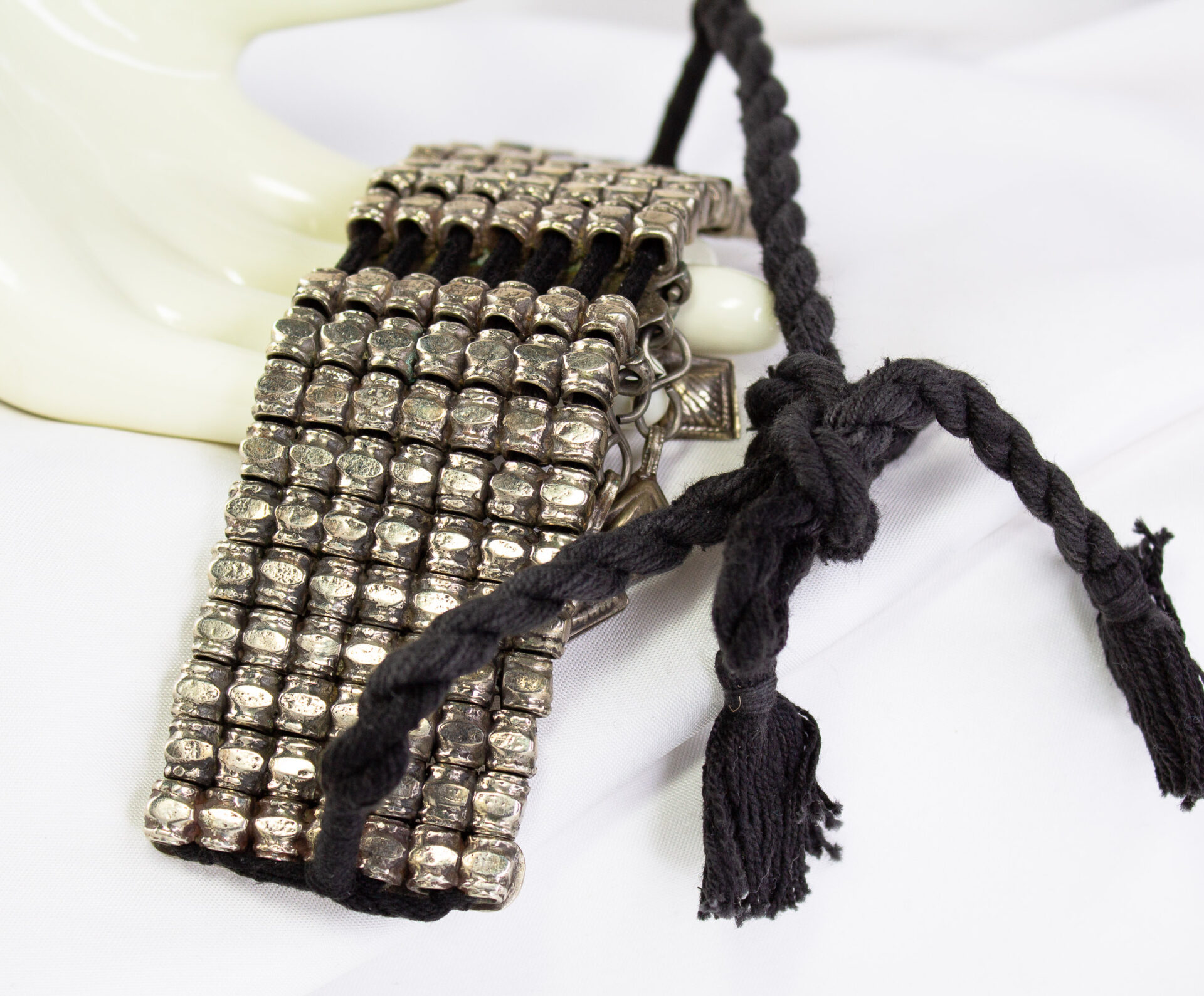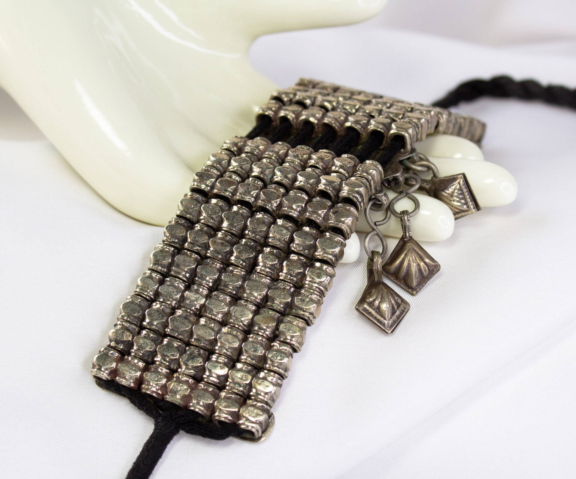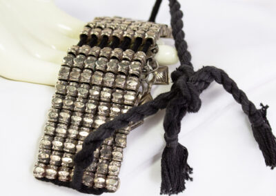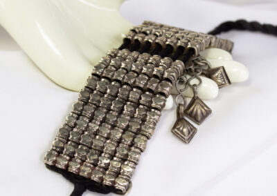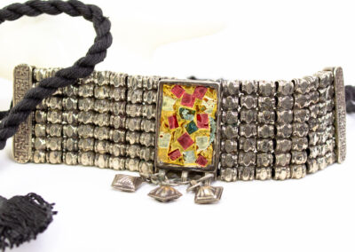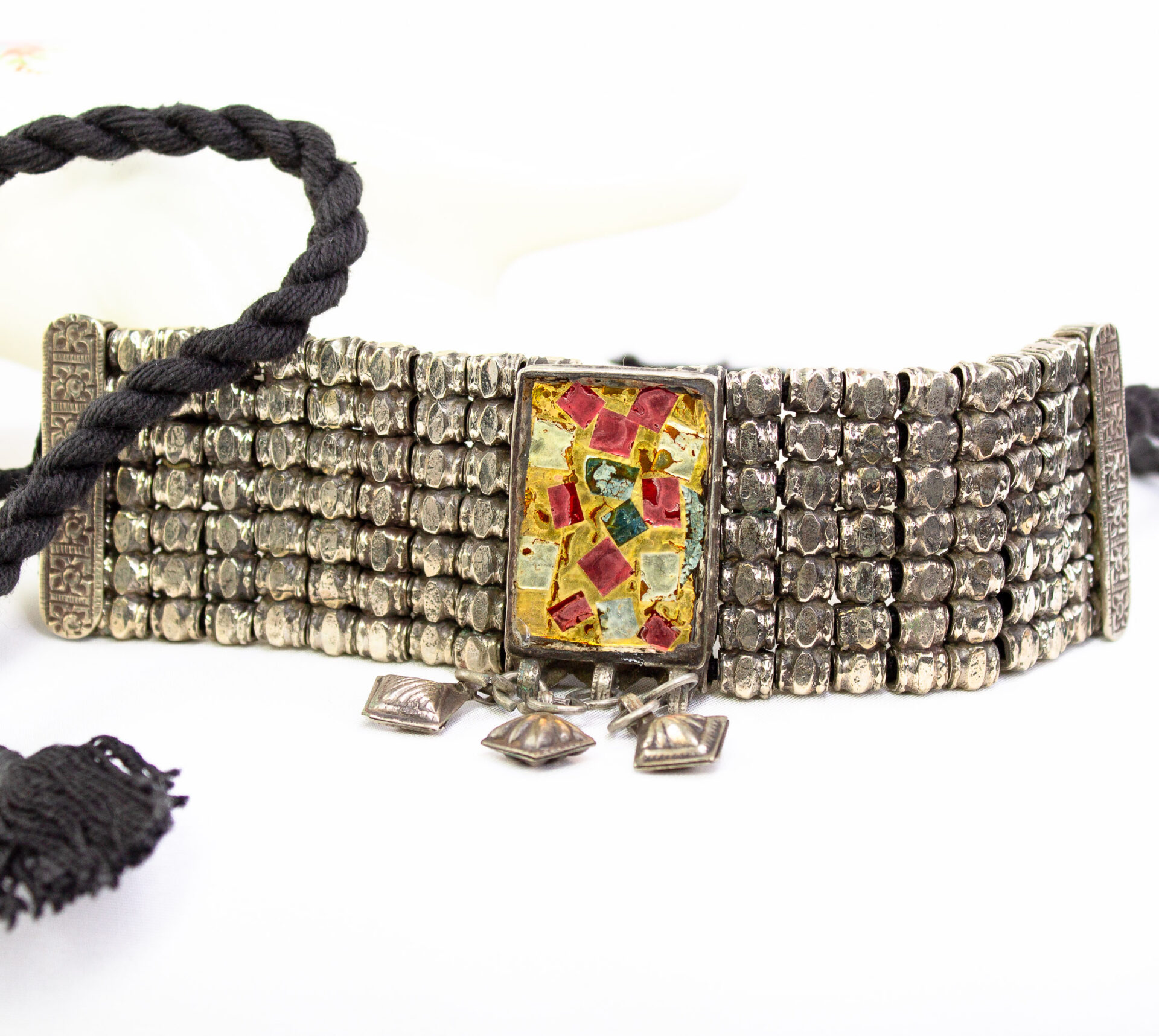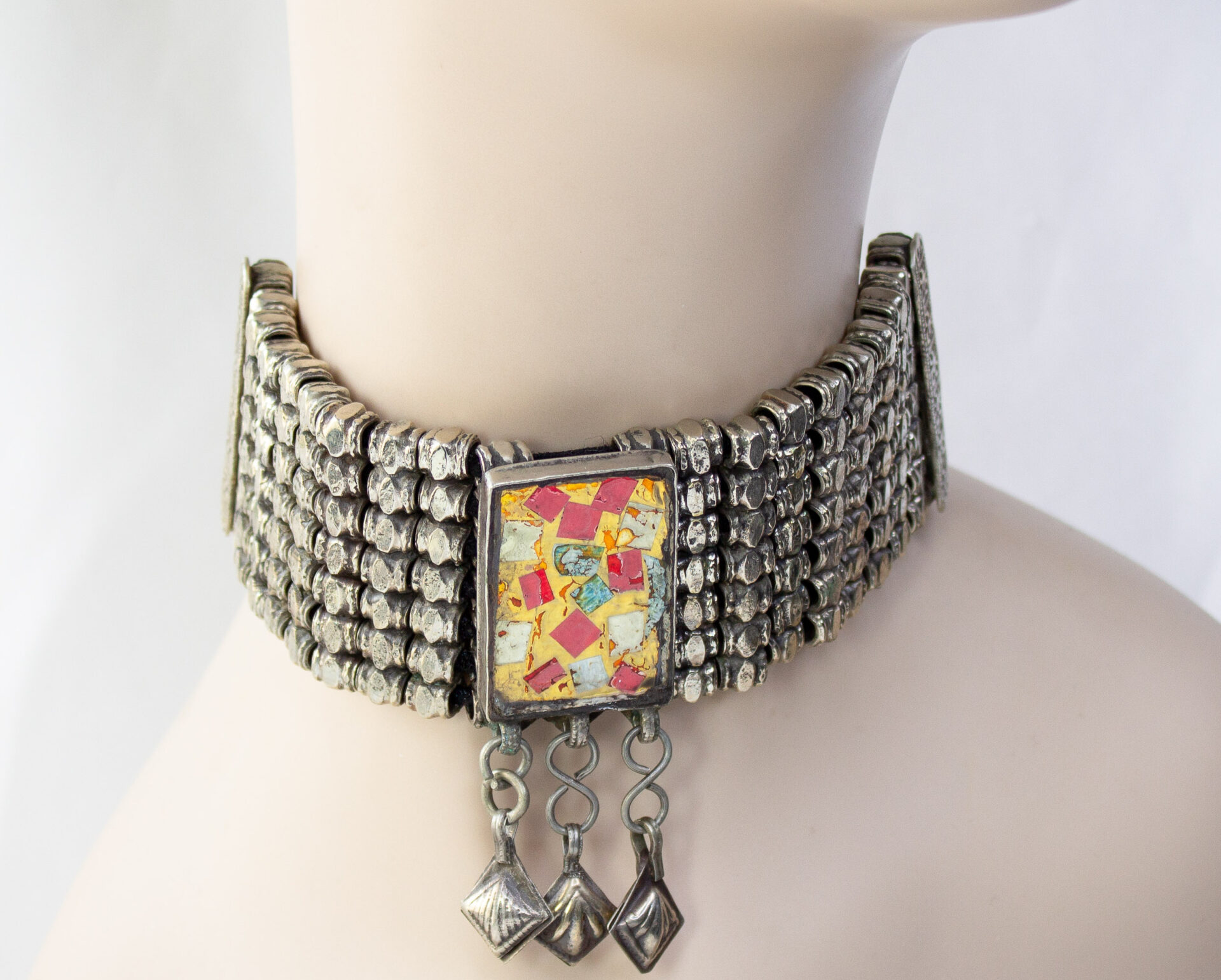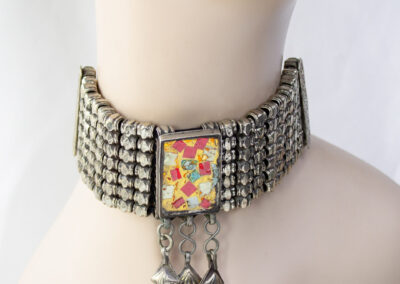 Afghani Choker Necklace Features A Wide Articulated Silver-tone Metal Band With A Mosaic Style Central Pendant And Hanging Dangles