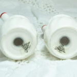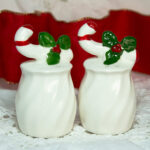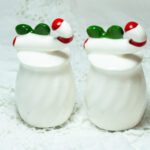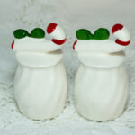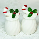 Cute Little Pair Of Crisp White Salt And Pepper Shakers With Candy Cane On Top Decorated With Holly Leaf