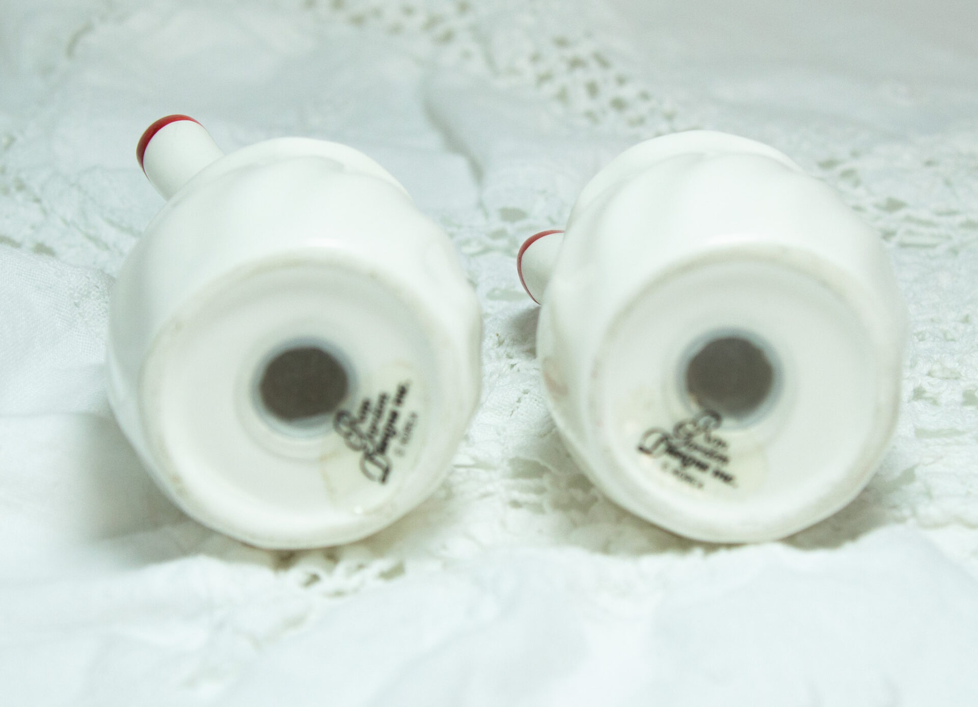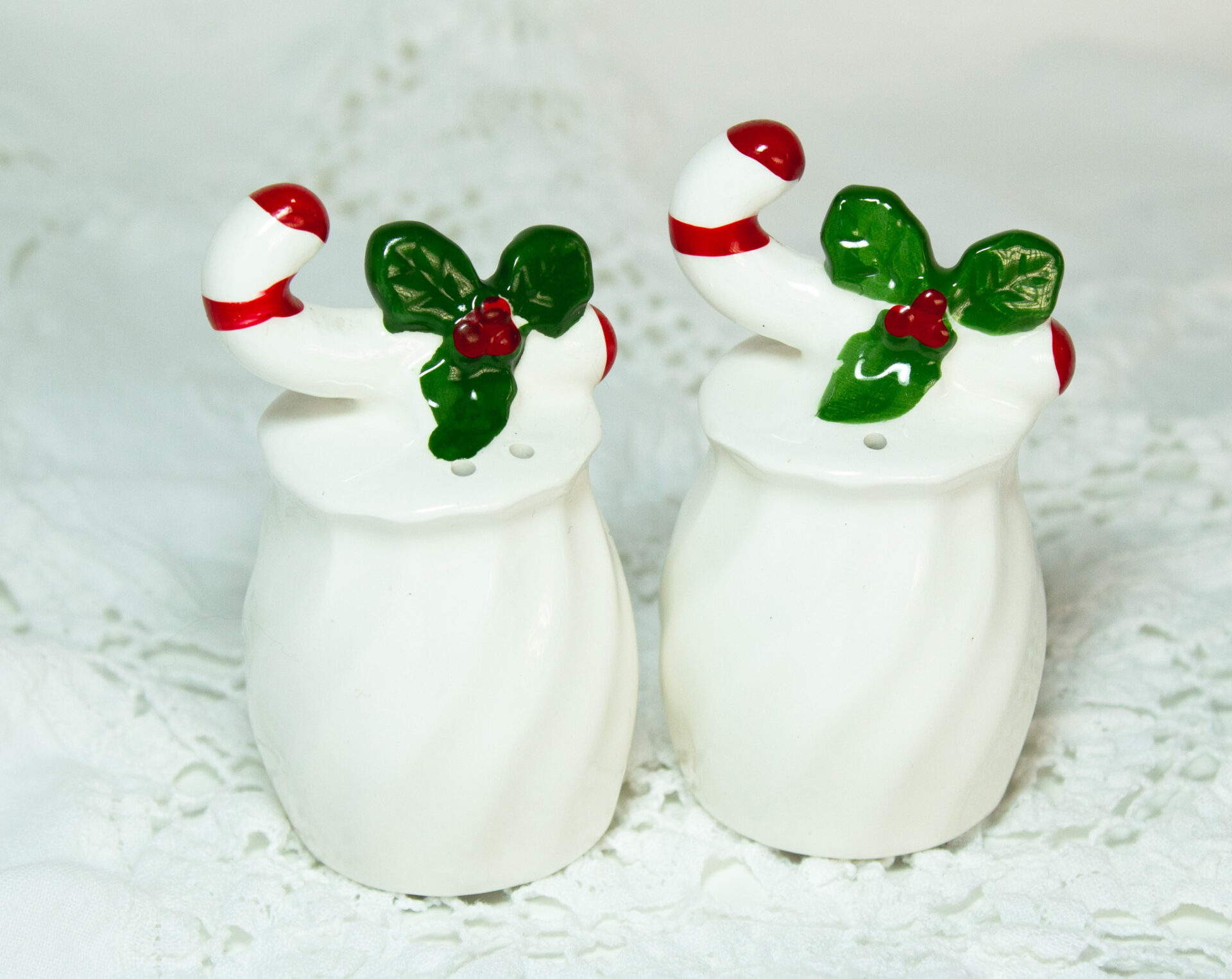 Cute Little Pair Of Crisp White Salt And Pepper Shakers With Candy Cane On Top Decorated With Holly Leaf