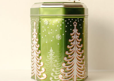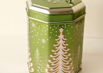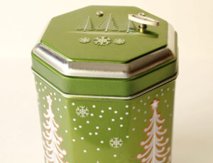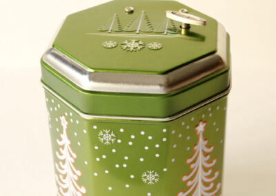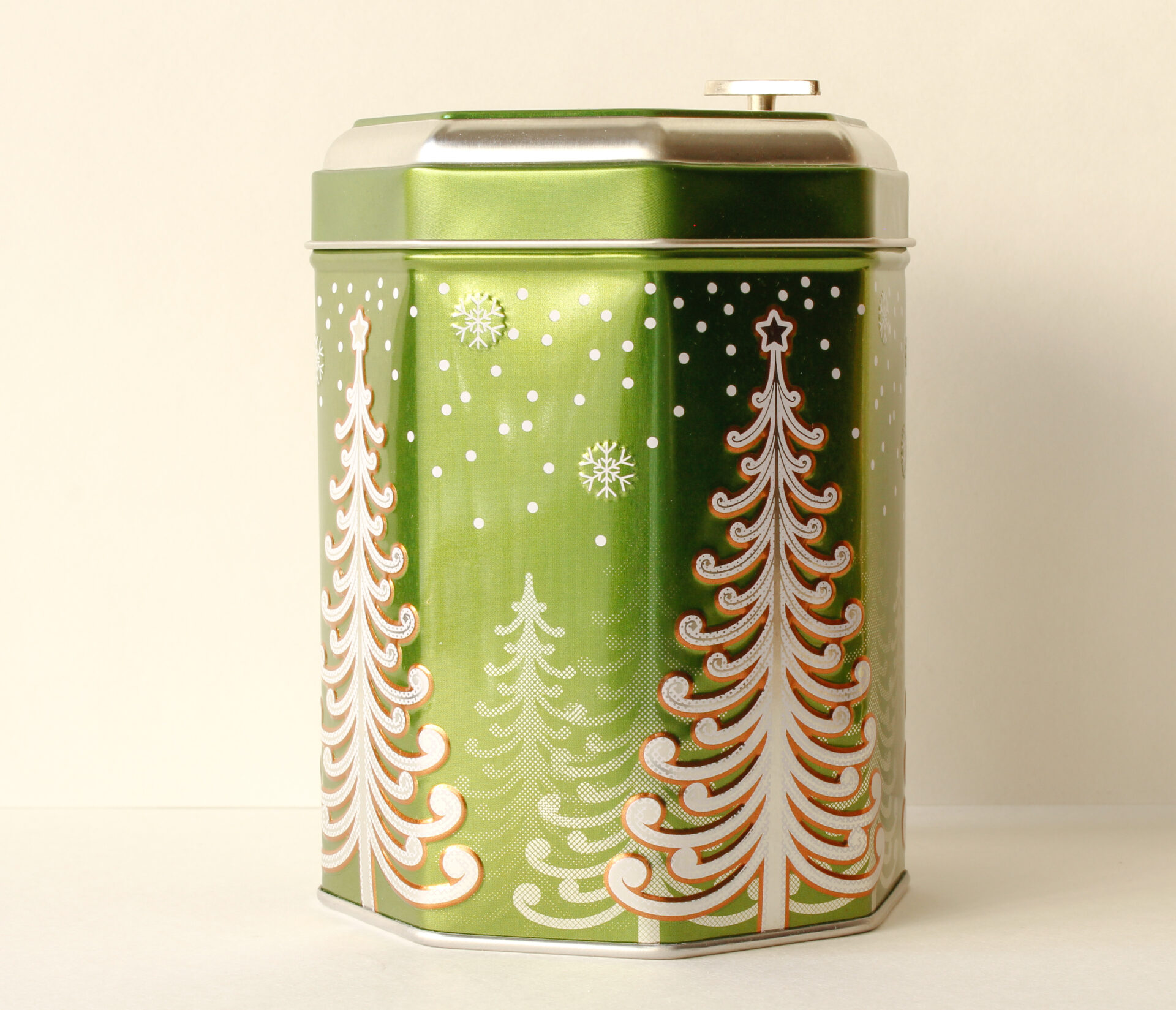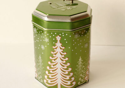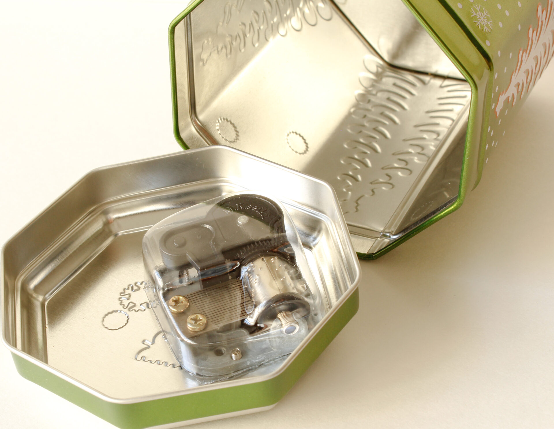 Green Christmas tree tin plays “O’ Christmas Tree”.
