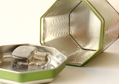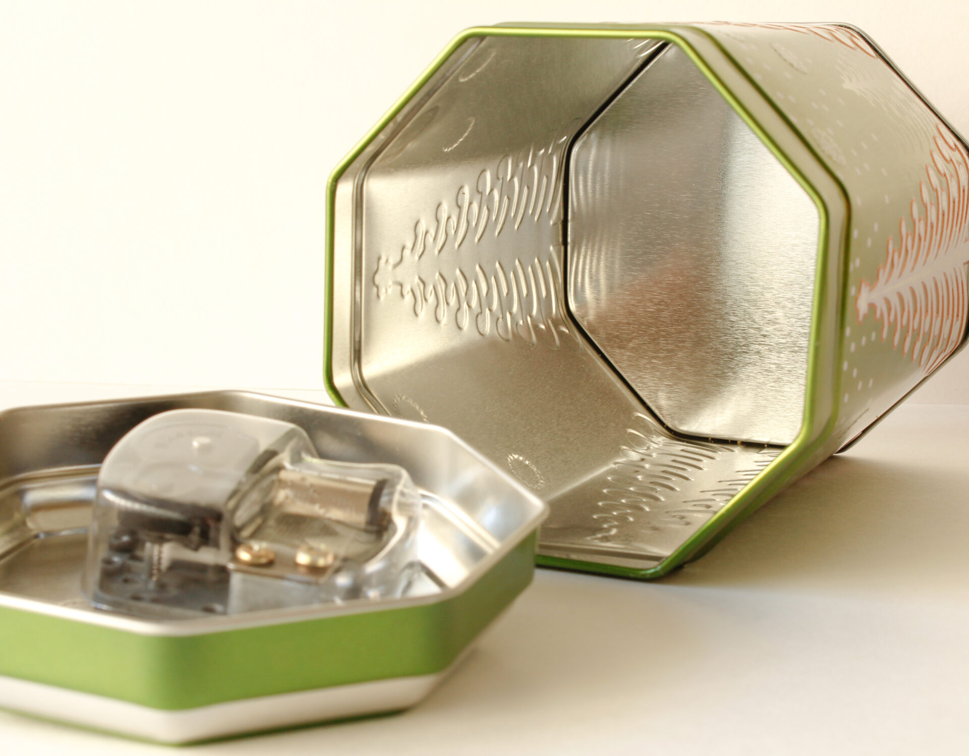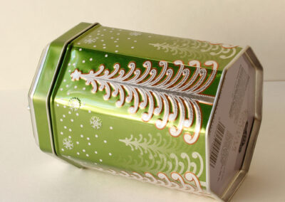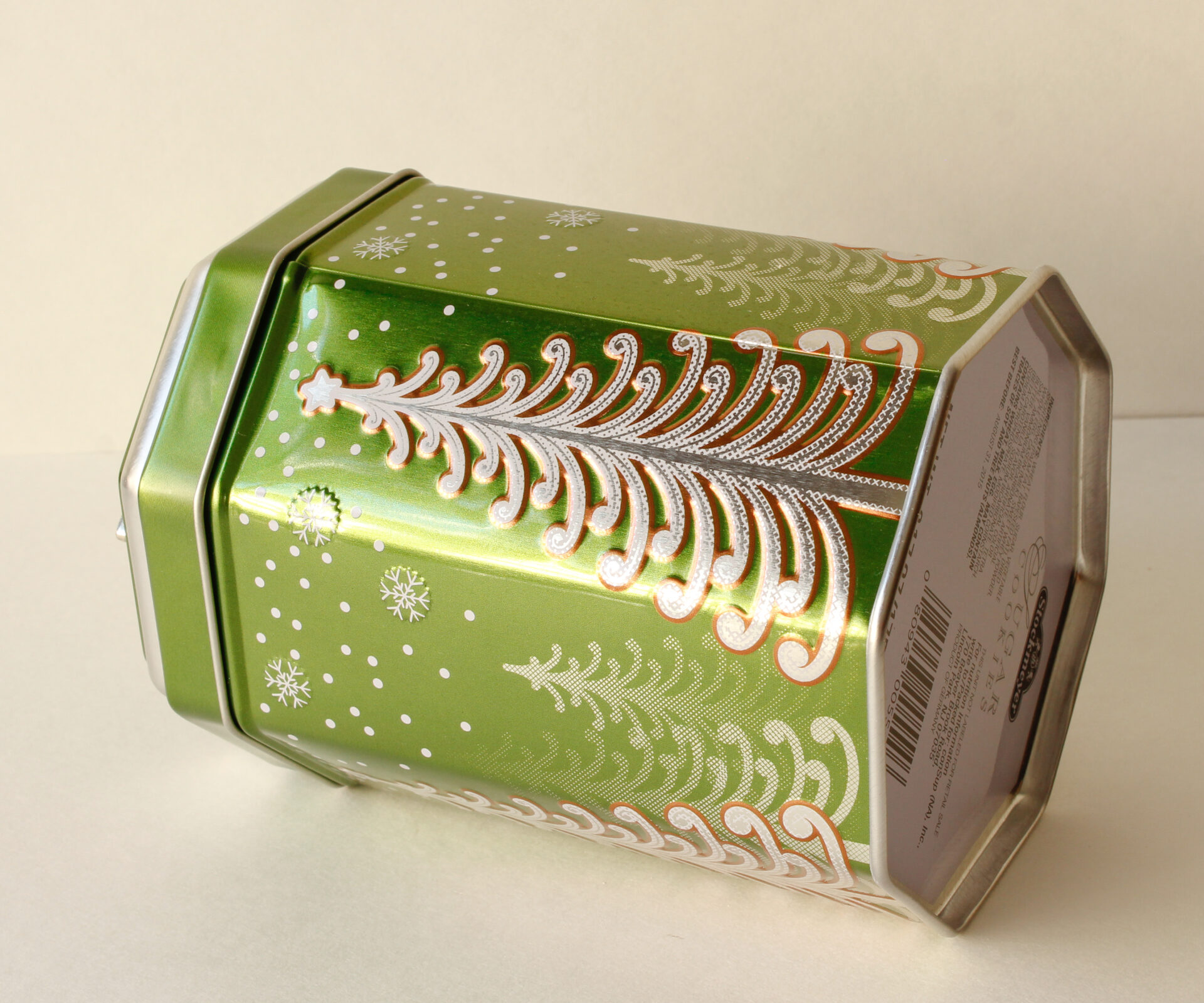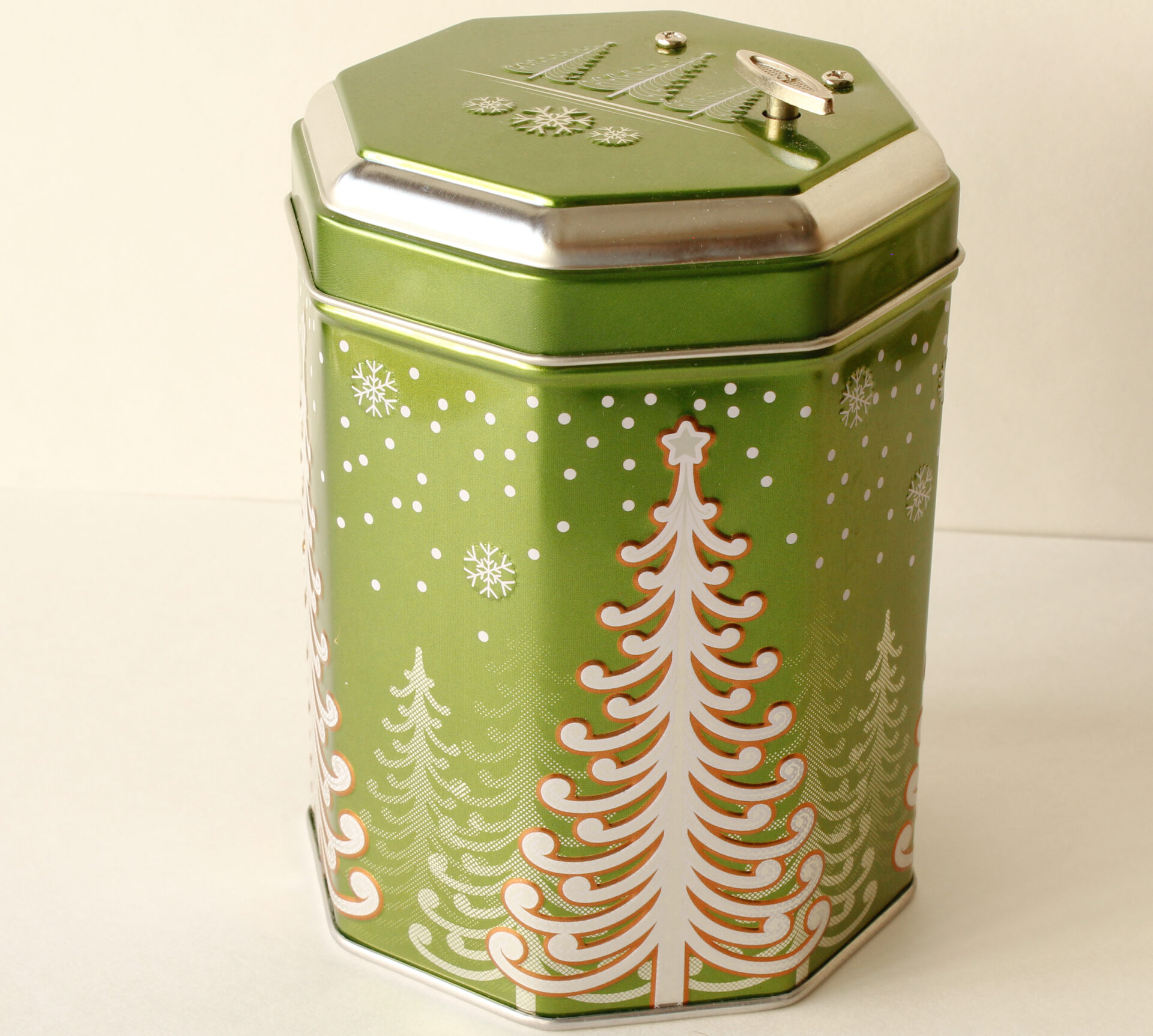 Green Christmas tree tin plays “O’ Christmas Tree”.