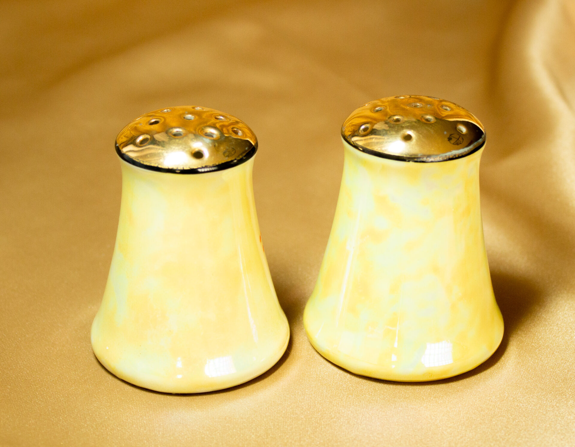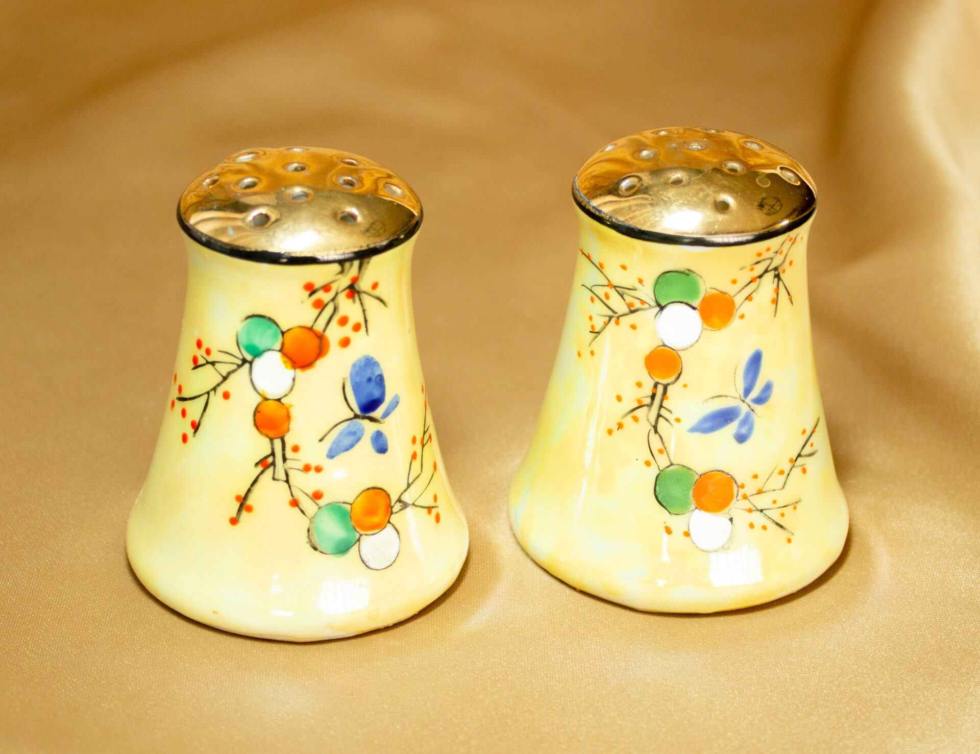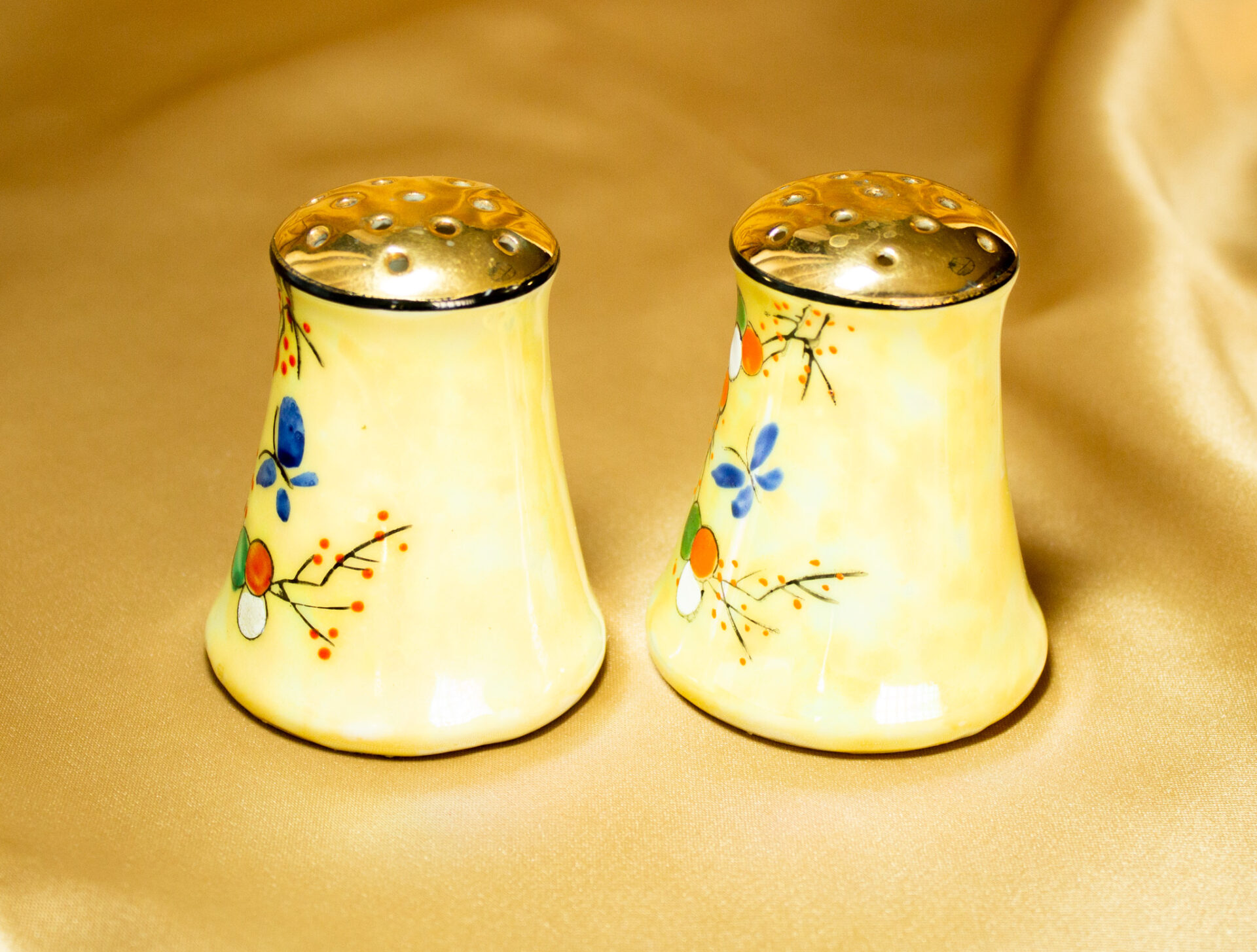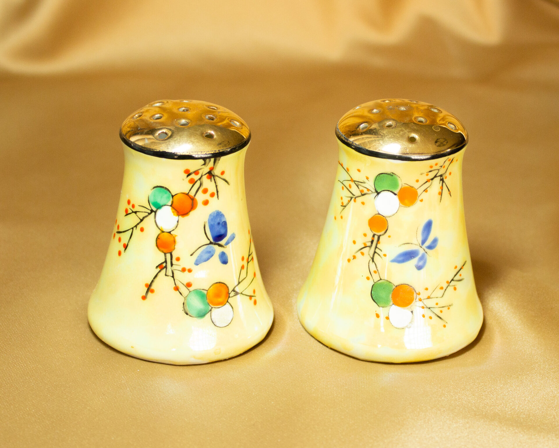 Yellow Lusterware Salt and Pepper Shakers Feature Hand Painted Branches and A Butterfly