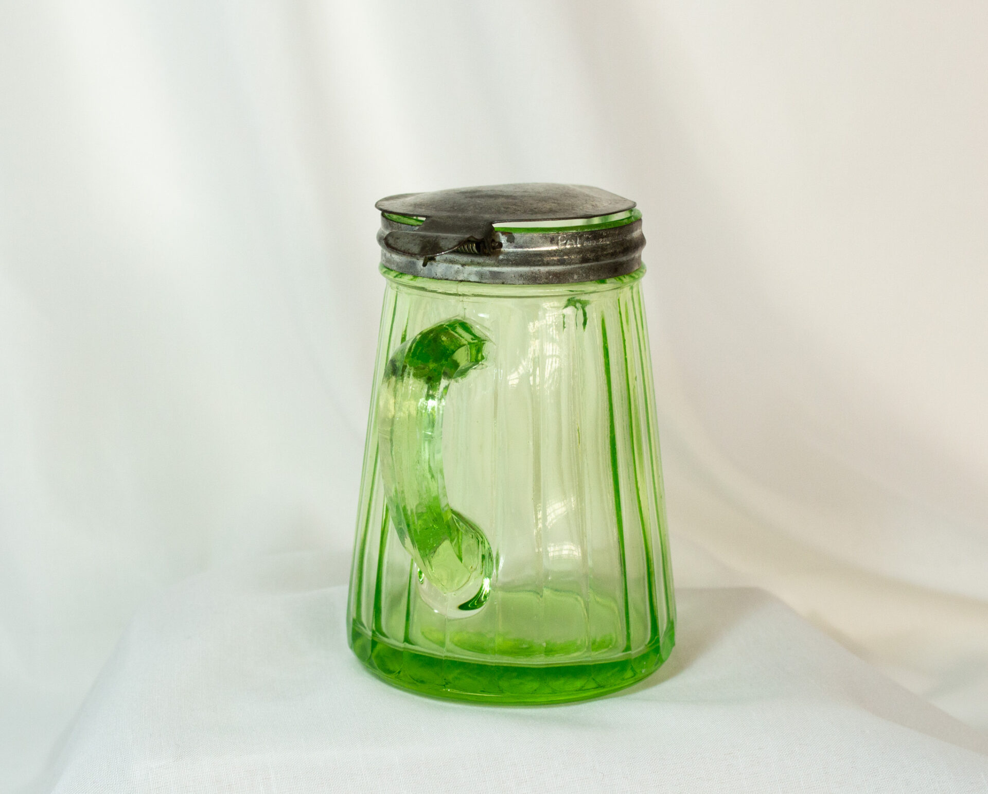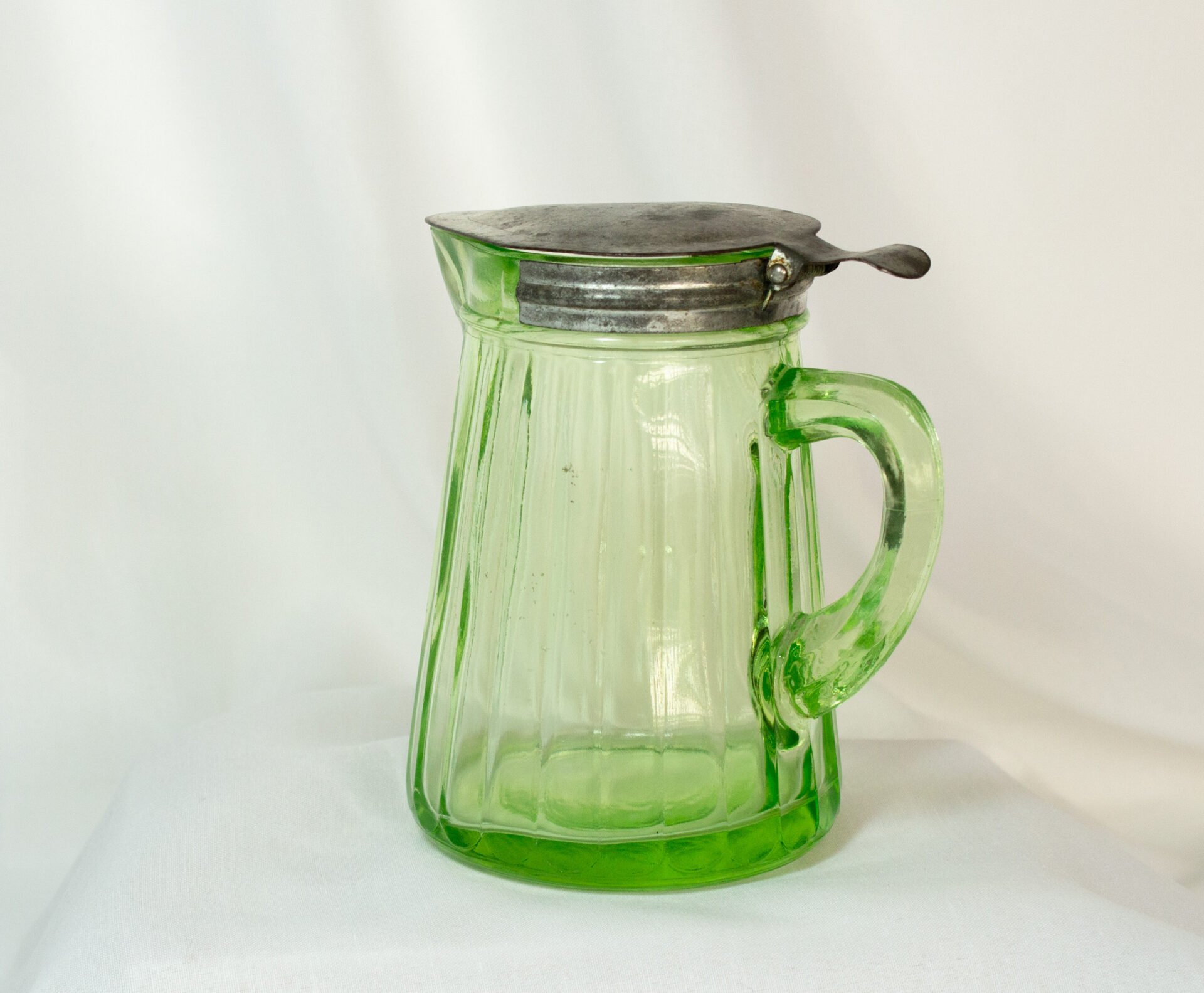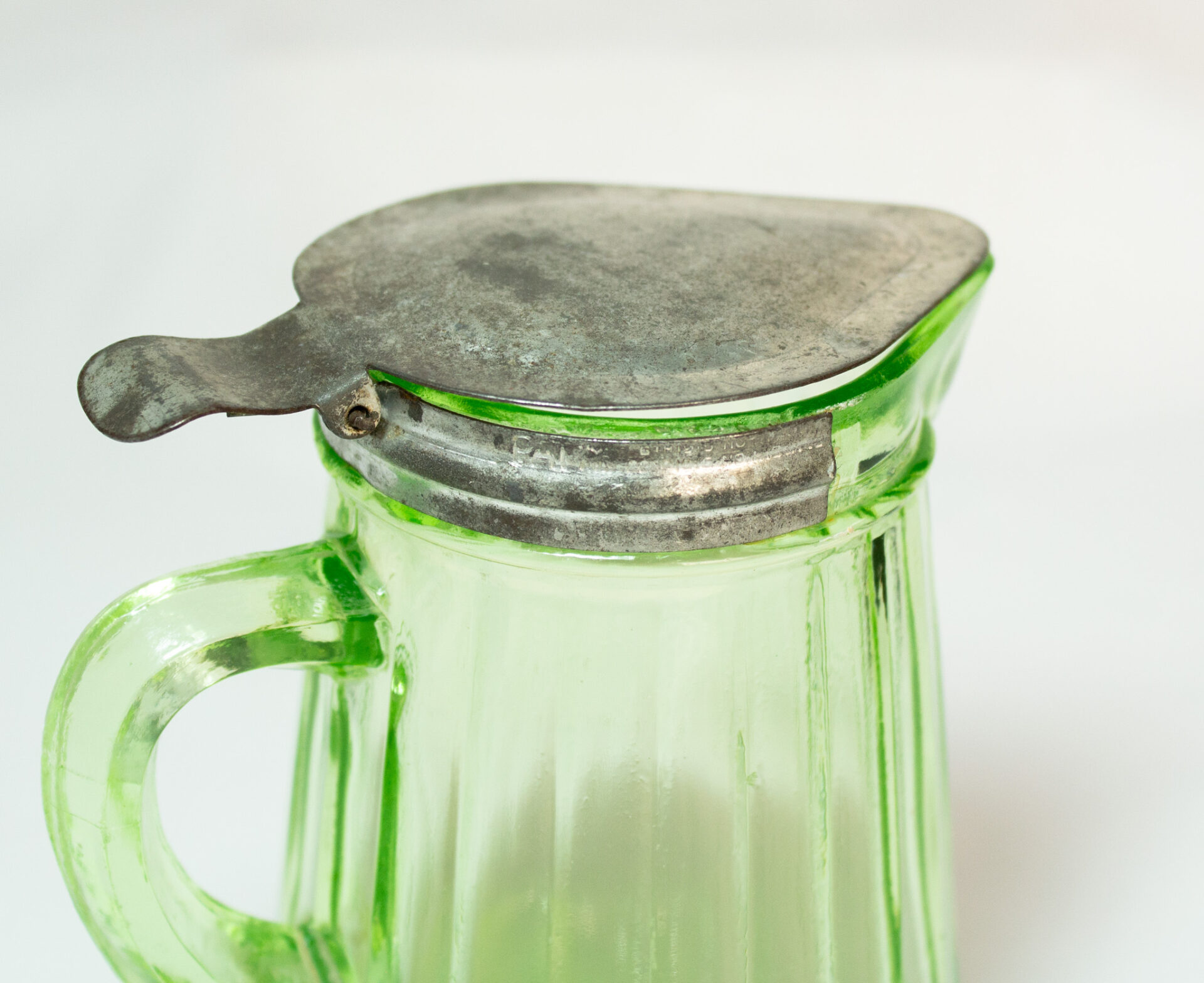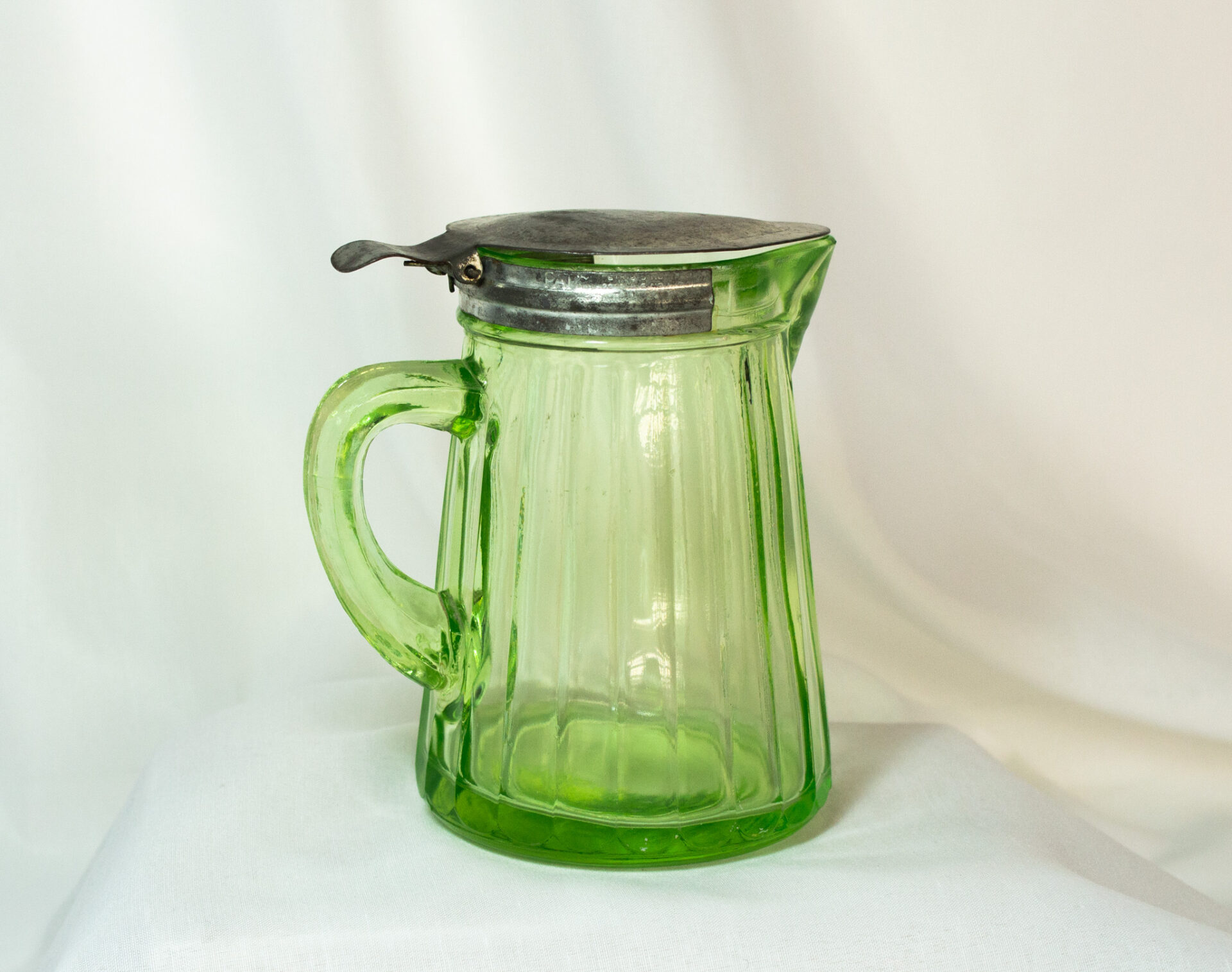 Uranium Glass Syrup Pitcher With Tin Lid Dated 1916