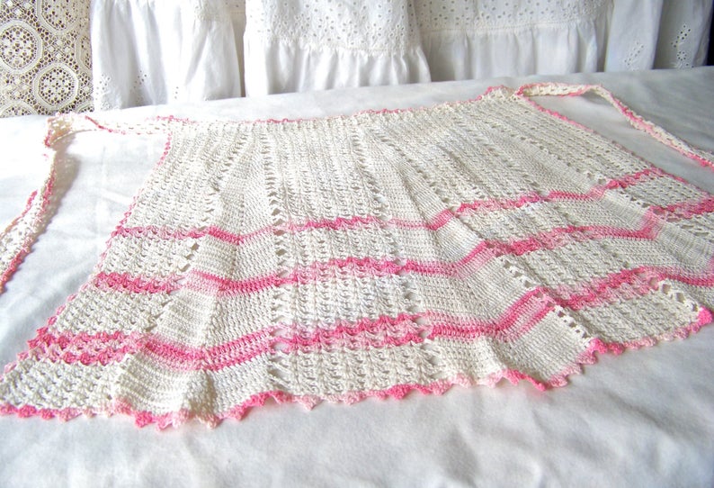 Kitchen apron measures 14 inches from waistband to hem by 21 inches wide at the hem.