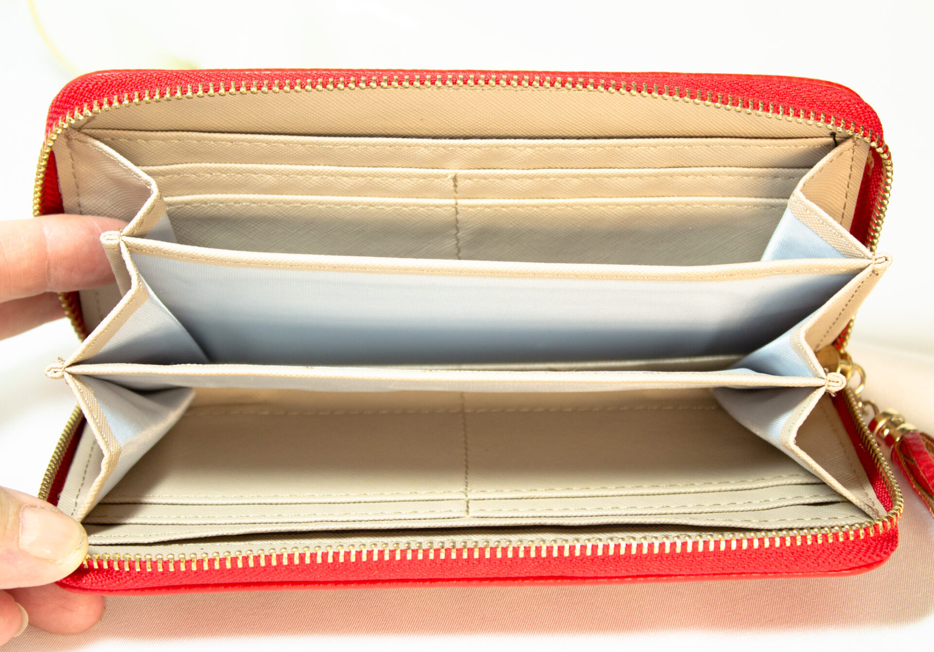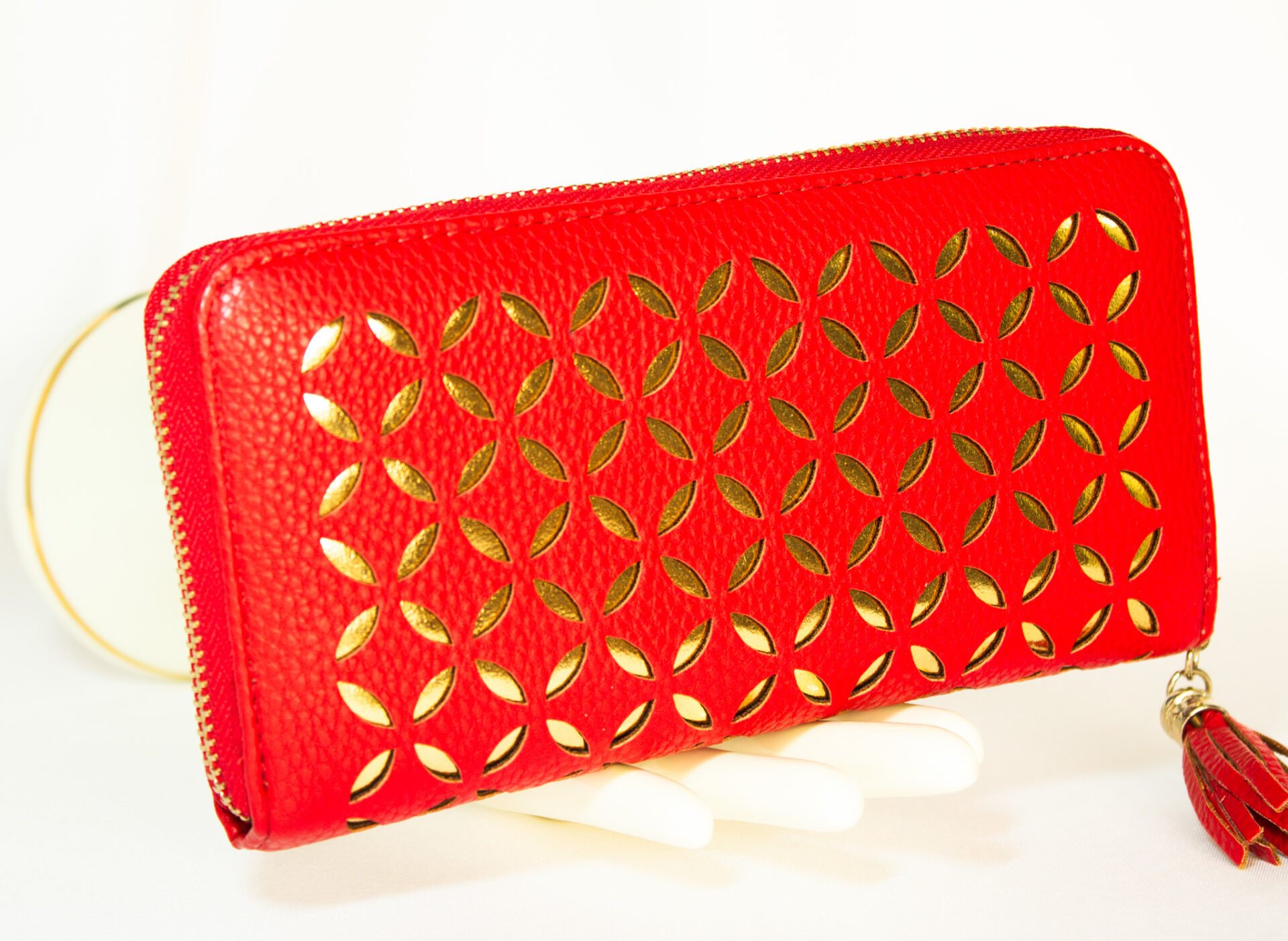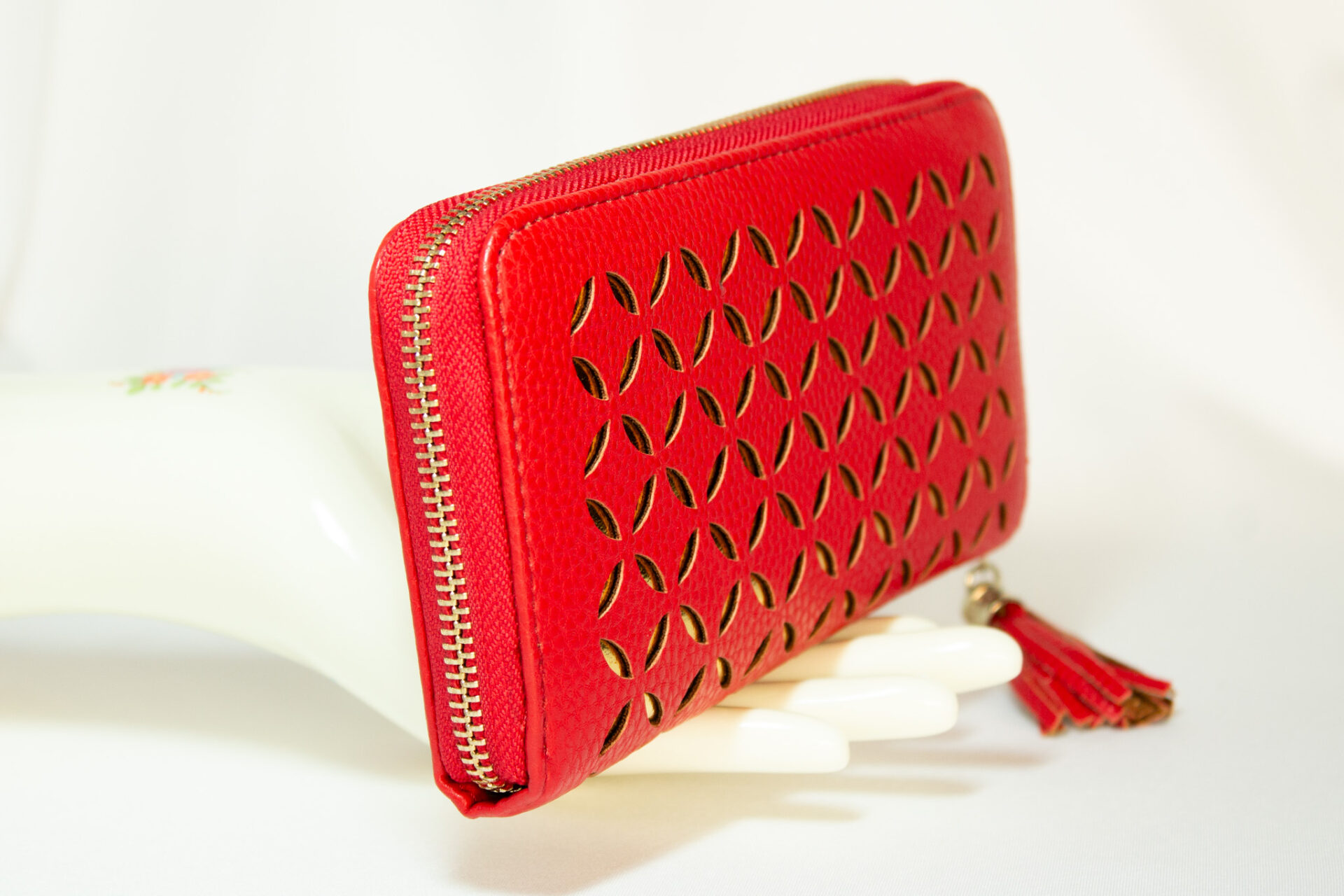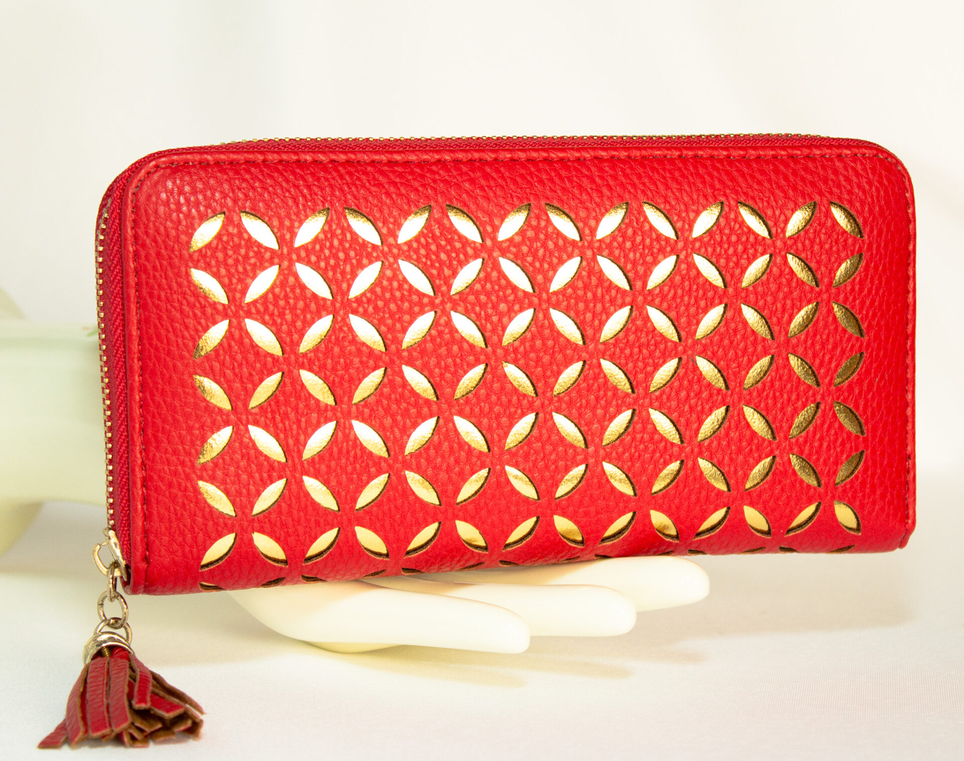 Bright Red Zippered Wallet With Gold Tone Accent.
